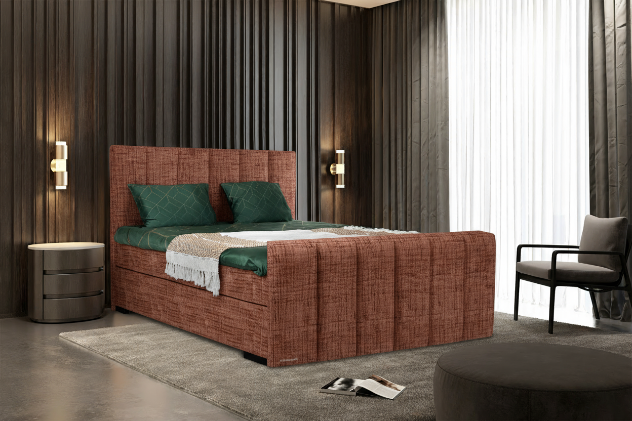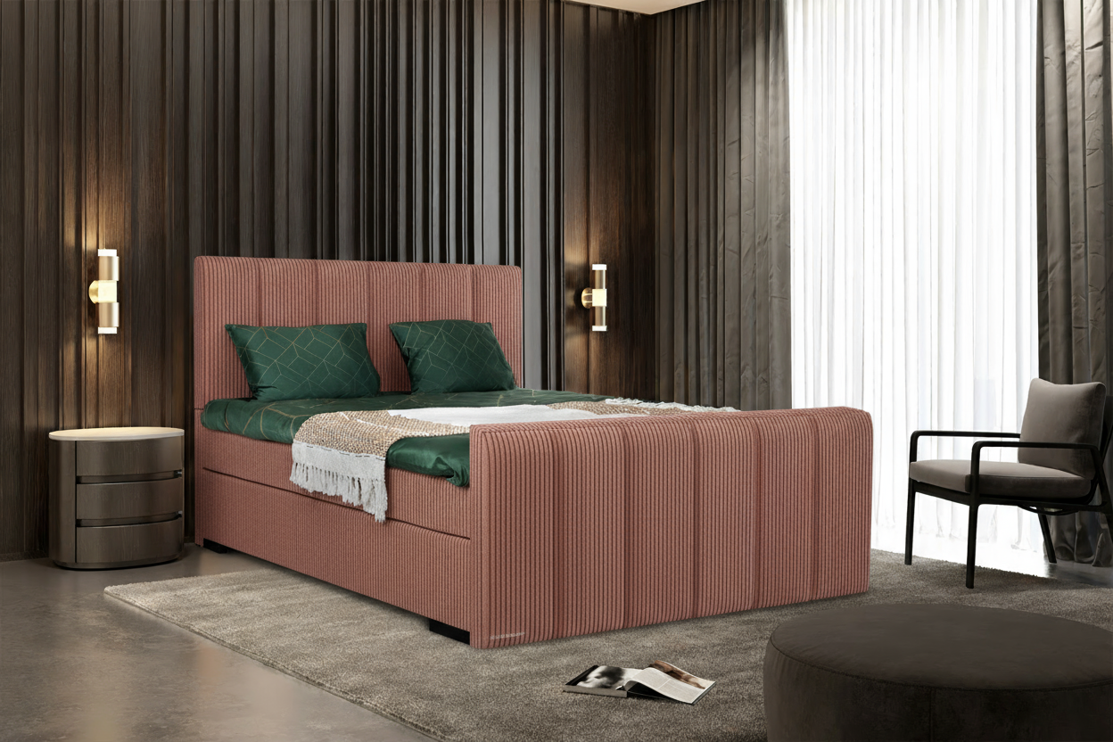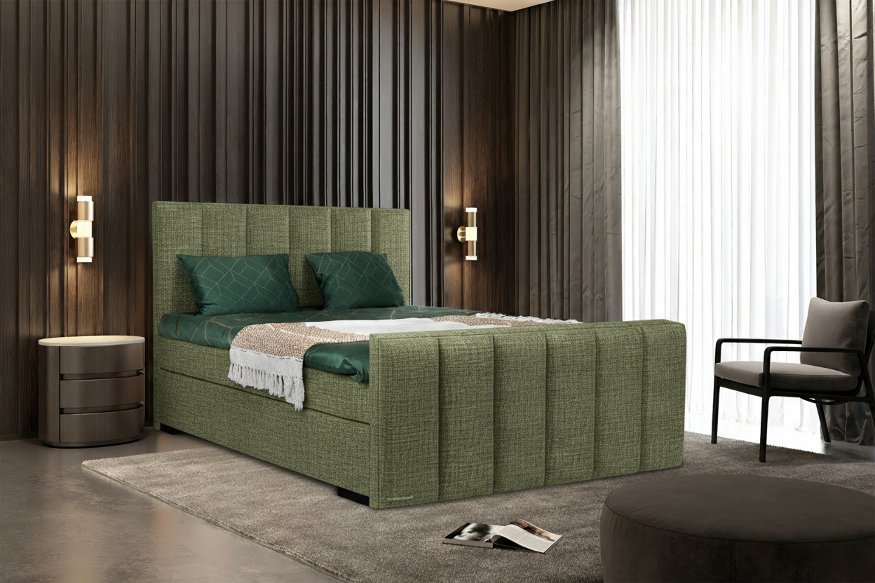 De boxspring Novia heeft een hoofdbord met zes verticale balken van 1,2 meter hoog. Het ontwerp straalt rust en luxe uit en past moeiteloos in zowel moderne als klassieke interieurs. Met keuze uit verschillende stoffen, onderboxen, poten en matrassen stel je de Novia volledig samen naar jouw persoonlijke smaak en comfort. Daarnaast kun je kiezen voor een voetbord met zes balken, dat perfect aansluit bij het hoofdbord, of een TV-lift voor extra luxe en gebruiksgemak.