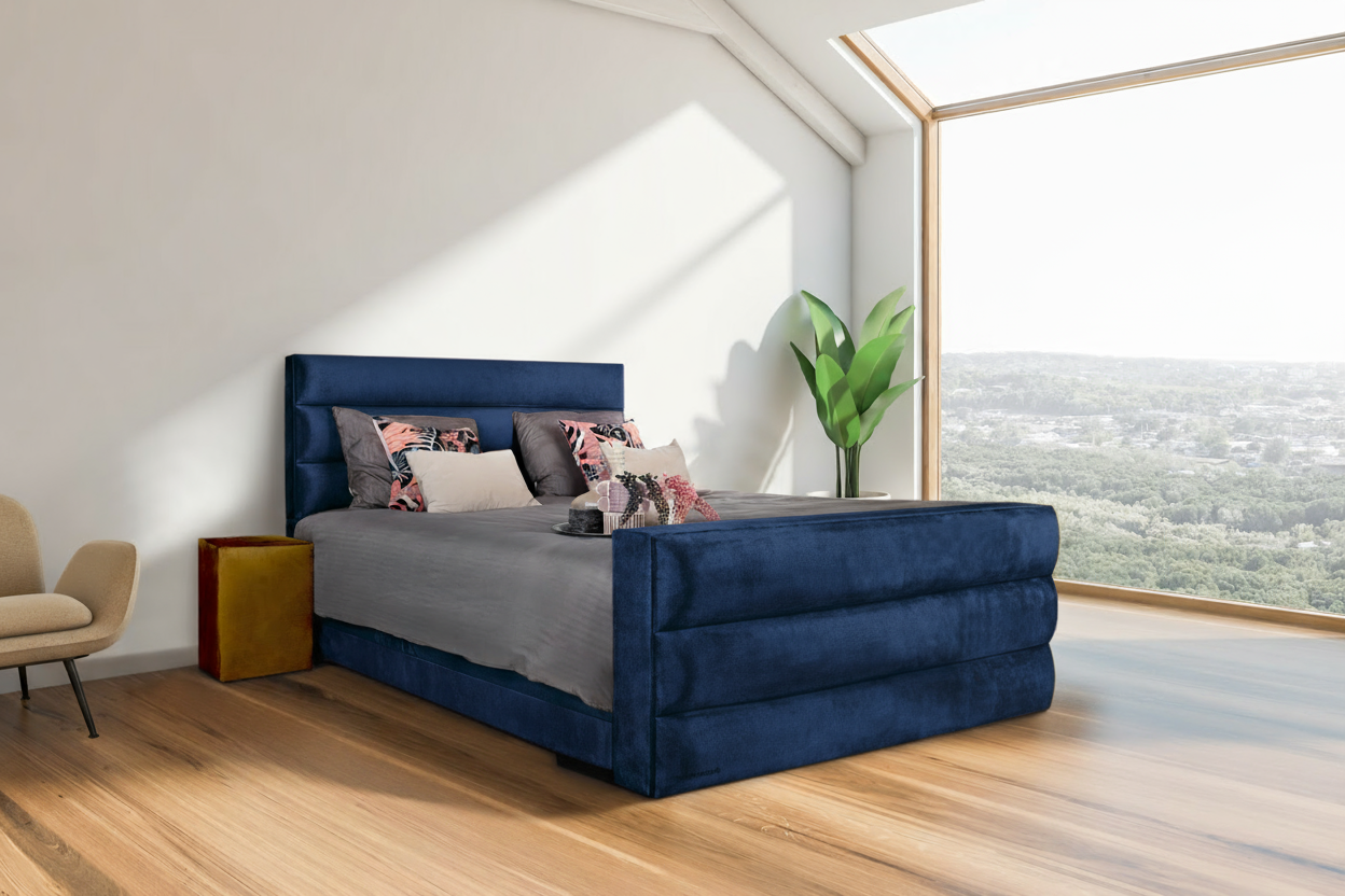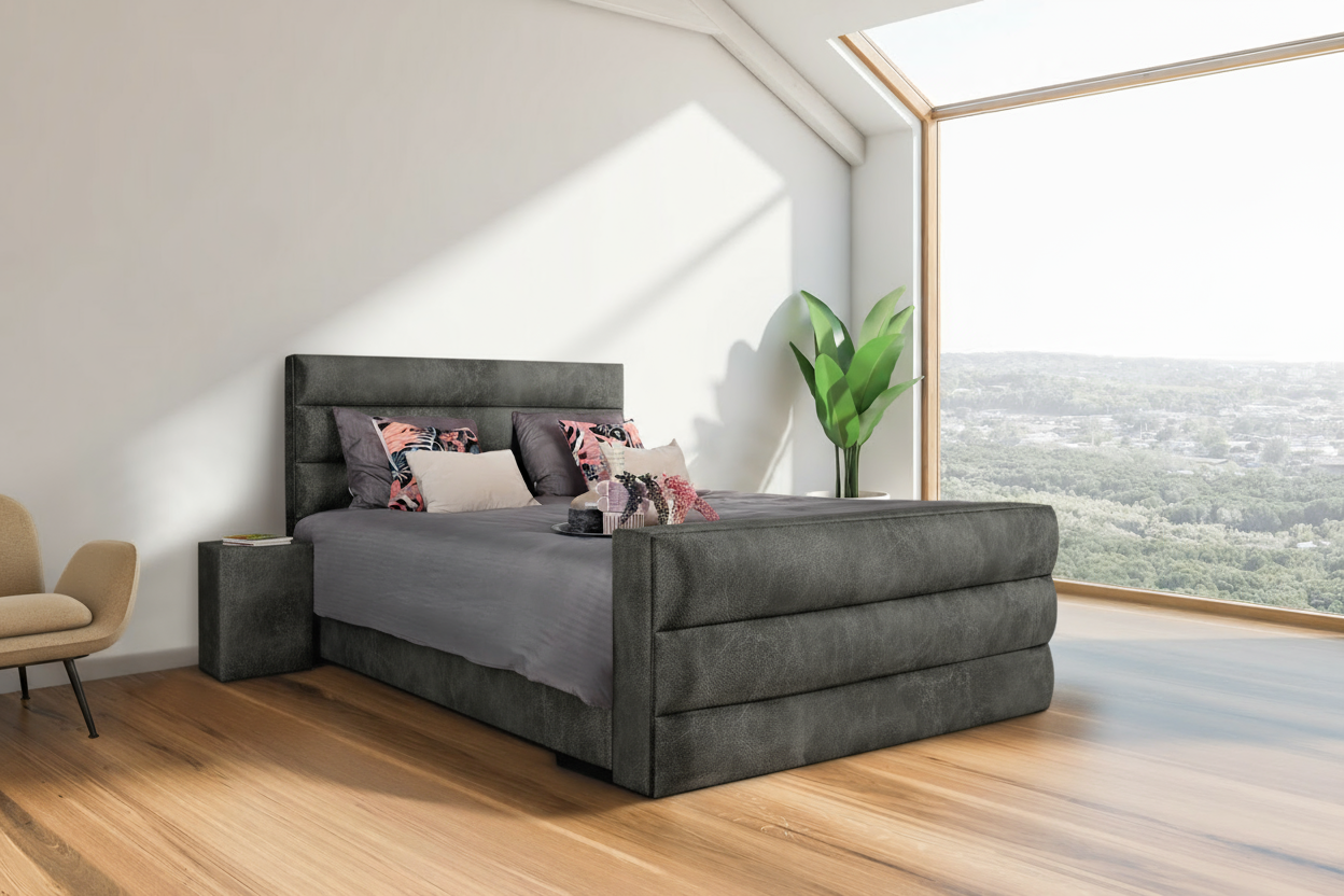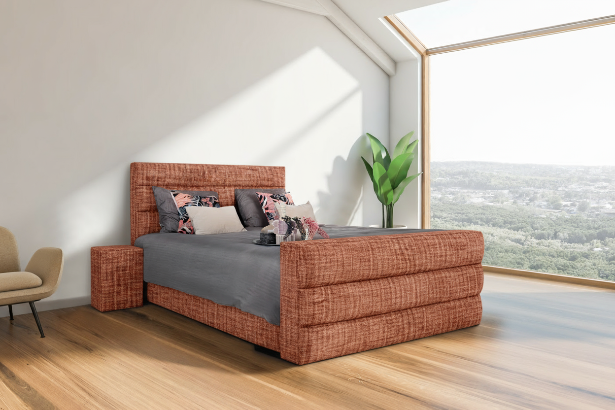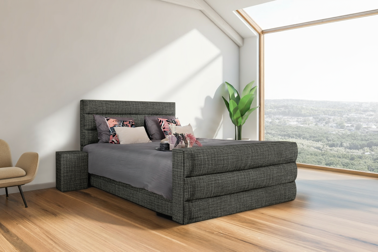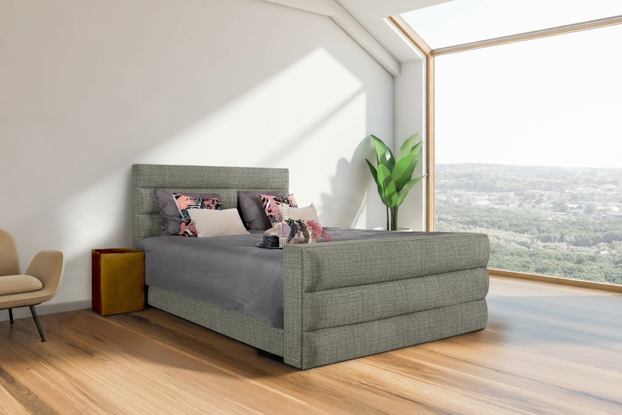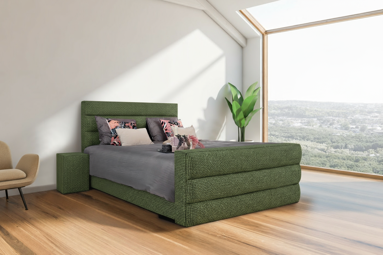 De boxspring Olivia heeft een modern hoofdbord met drie horizontale banen van 1,2 meter hoog. Het tijdloze ontwerp straalt rust en balans uit en past moeiteloos in elk interieur. De brede banen geven het bed een warme en eigentijdse uitstraling. Je kunt de Olivia volledig naar wens samenstellen, met keuze uit verschillende stoffen, onderboxen, poten en matrassen. Daarnaast is er de mogelijkheid om te kiezen voor een voetbord met drie balken, passend bij het hoofdbord, of een TV-lift voor extra luxe en gebruiksgemak.